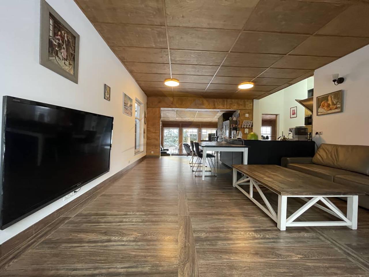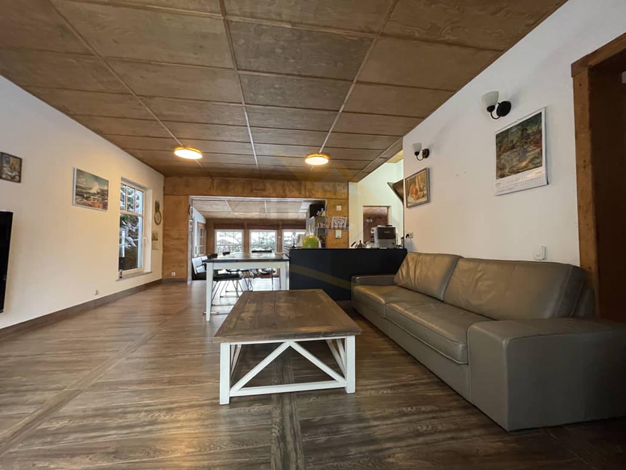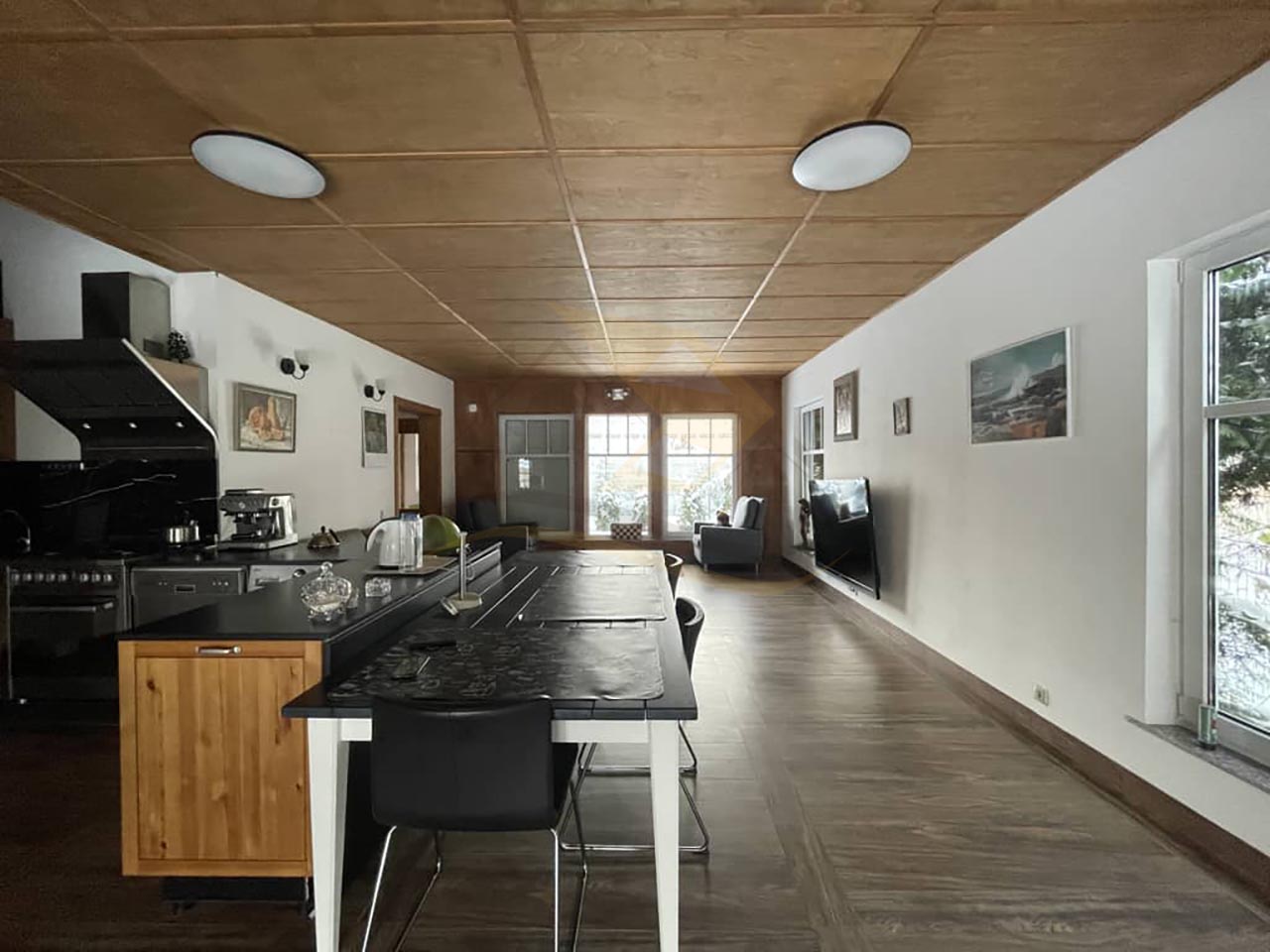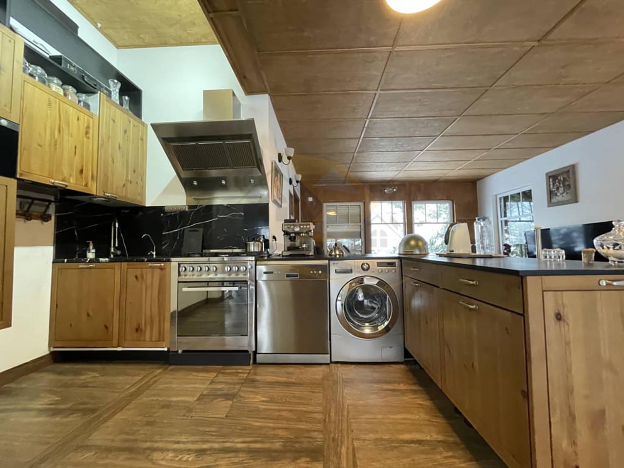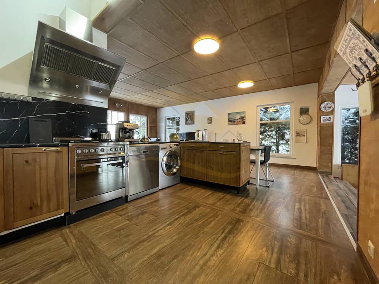 Удобная планировка: просторная кухня-гостиная с камином, 4 спальных комнаты (двухспальные кровать и диван, 3 односпальные кровати), три санузла.