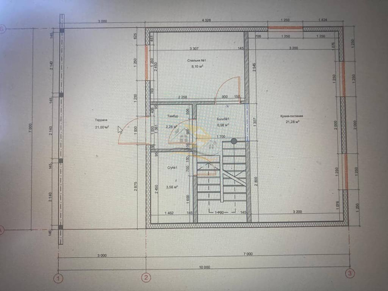 • 1 ЭТАЖ: терраса (21 кв.м.), тамбур с холлом (9,30 кв.м.), кухня-гостиная (22 кв.м.), спальня (8 кв.м.), санузел (3,58 кв.м.).
